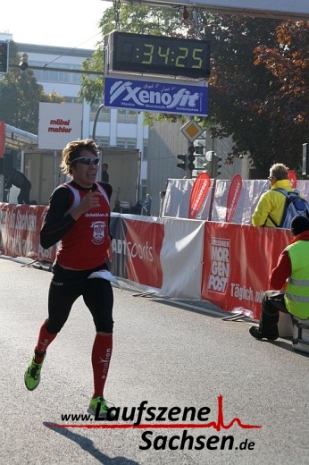 Die ersten 10 Kilometer wollte ich eher kraftsparend in einer Gruppe mit „schwimmen“. Ich fühlte mich auch zu jeder Zeit locker, konnte mit dem Tempo spielen und musste mich streckenweise schon bremsen. Teilweise kam es mir auch zu langsam vor, aber der Gruppe wegzulaufen und alleine von Beginn an zu laufen, hatte keinen Sinn. Jedenfalls erfuhr ich dies letztes Jahr, die restliche Strecke war nicht zu unterschätzen. Zudem blieb für einen „Ausreißversuch“ noch genug Zeit. Bei Kilometer 10 (37:15 min) wurde es mir dann doch zu langsam und ich ergriff selbst die Initiative. Ab Kilometer 15 ging es dann auch schwerer. Die Beine fühlten sich nicht mehr so locker an, und wollten nicht mehr das Tempo so locker laufen wie vorher. Jetzt musste ich schon ganz schön kämpfen und vermisste die vorherige Lockerheit. Nun hatte ich auch nur noch einen Begleiter. Ab Kilometer 18 gab ich dann nochmal alles, um auf den enteilten Läufer vom LAC Chemnitz aufzulaufen. Und schon war ich alleine, keiner aus der früheren Gruppe war noch da. Schade war auch, dass die Getränke in Plastikbechern verteilt wurden und diese immer zerbrachen. Erst bei der vierten Verpflegung nahm ich mir richtig Zeit etwas zu trinken, das war dann auch das einzige Mal, dass ich einen kleinen Schluck Wasser zu mir nehmen konnte und diesen auch brauchte. Bei etwas wärmeren Temperaturen hätte das ganz anders ausgehen können …!